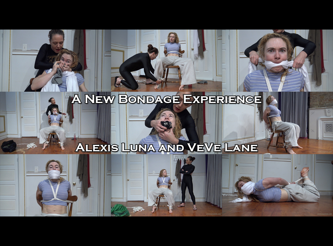 Alexis is left alone, cleave gagged and bound in her chair. She murmurs and mmphs as she explores her bonds, wiggles, struggles, and tests the ropes. VeVe returns with her bag of loot and decides to ungag the homeowner. But upon being ungagged, Alexis -- still cheery and curious -- says that she actually liked being gagged and would prefer to be gagged again. In fact, she'd like the gag to be even more mouth-filling...