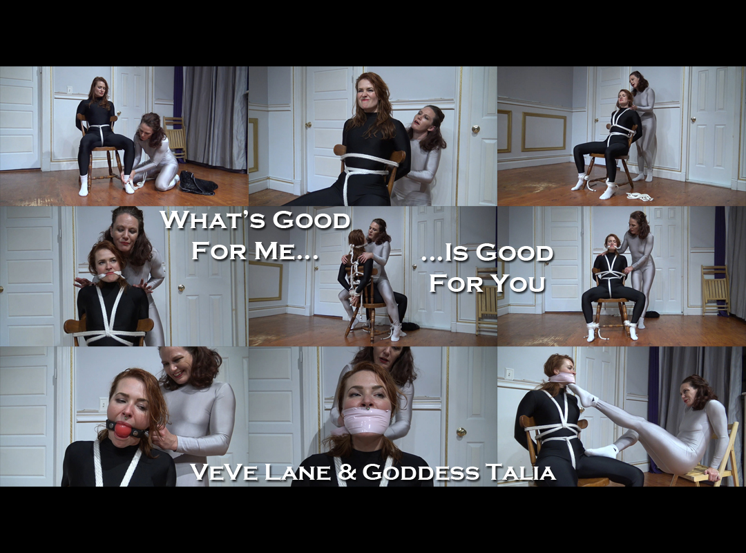 Chair Bondage scenario. Talia bound in chair for 20+ minutes. Tying occurs slowly and gradually over the course of approx 7 minutes. Both ladies wear spandex bodysuits and white ankle socks.